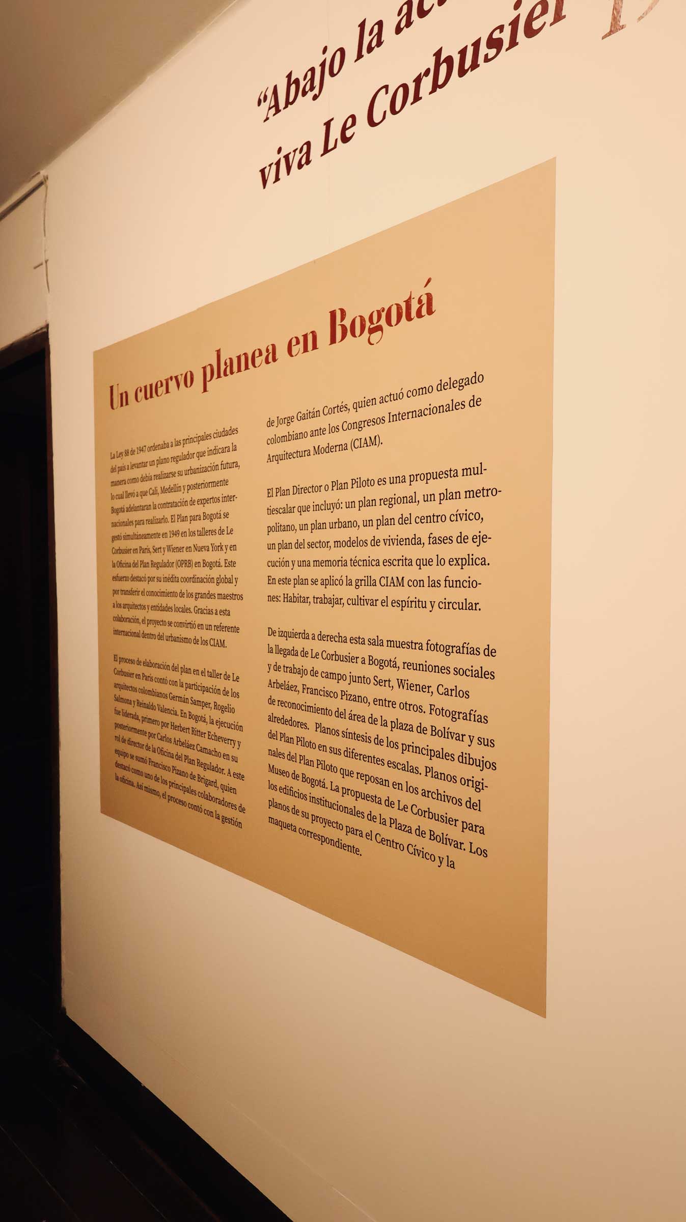 La presencia de esta exposición en Bogotá cobra especial relevancia si se recuerda que Le Corbusier visitó la ciudad entre 1947 y 1951, periodo durante el cual trabajó en el Plan Piloto, formulado en 1950 con la colaboración de Josep Lluís Sert y Paul Lester Wiener. Más que una propuesta arquitectónica, el Plan Piloto constituye una reflexión integral sobre la forma en que la ciudad debía crecer y organizarse.